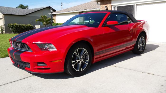 Ford Mustang Convertible PREMIUM 2014 - exterier Race Red, interier v tmavé kůži Char. Black Turned Mini Leather, plná výbava PREMIUM, el. sedačky, elektricky stahovací střecha, šestistupňová automatická převodovka s možností ručního řazení, tempomat, 17 litá kola s pneu 215/65 R17, Equipment Group 201A, Audio SHAKER, Bluetooth, USB, AUX, xenonové svštlomety, vzadu LED světla, kompletní specifikace vozu zde: http://researchmaniacs.com/VIN-Number-Lookup/WindowSticker/FordSticker.html?title=1ZVBP8EMXE5264963 . Mustang je PRODÁN, možnost objednání stejného automobilu.